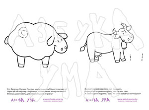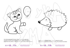 А еще есть 4 вкладки с развивающими рисунками для развития мелкой моторики малышей. Вы познакомите ребенка с Веселой Овечкой, Милой Коровой, Непоседливым Котенком и Добрым Ежиком. Им нужно помочь, а для этого выполнить задание, которое написано под картинкой.