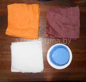 И мне очень хотелось, что бы у него была шляпа, и я её сделала. Из картона вырезала заготовки: маленький круг – верх шляпы, а большой с дыркой это основание. Склеила при помощи полоски картона, степлера и клея. И стала обклеивать для упрочнения обычными салфетками белыми, а потом креп-бумагой, ну а цвет выбрала коричневый. Сделала из той же креп-бумаги цветок и приклеила к шапке. И к голове деда тоже приклеила клеем такую шапку.