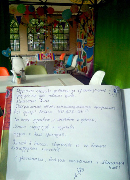 Вместе с квестом, в кафе открылась комната для проведения Дней Рождений. Теперь можно отметить День Рождения ребенка с его друзьями на свежем воздухе. Я очень плотно сотрудничаю с аниматорами кафе и квест стал обязательной программой Дней Рождений.