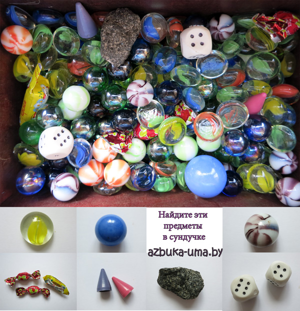 Смысл игры - найти загаданные предметы среди множества подобных. Сделать такую игру очень просто: соберите в одном контейнере множество маленьких предметов, а затем просите ребенка их найти.