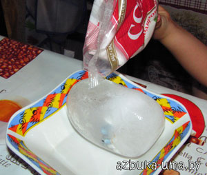 Достаем 4 шарика, оставшиеся нам еще пригодятся. Очищаем лед от самого шарика и выкладываем льдинки каждую в отдельную тарелочку. Первую тарелку оставляем на открытом воздухе таять при комнатной температуре. Во второй тарелке посыпаем лед солью. В третьей поливаем льдинку с игрушкой холодной водой, а в четвертой – горячей.