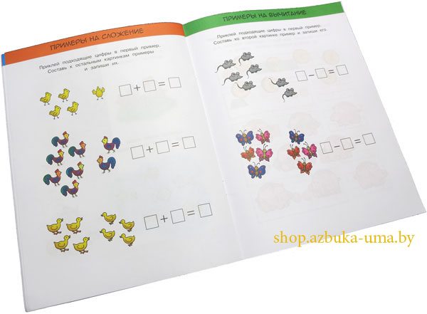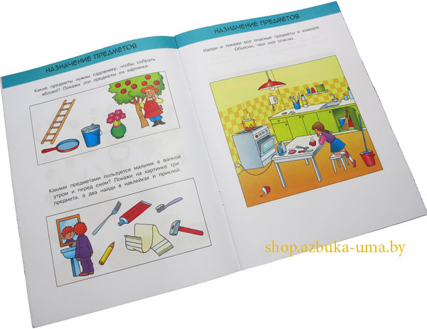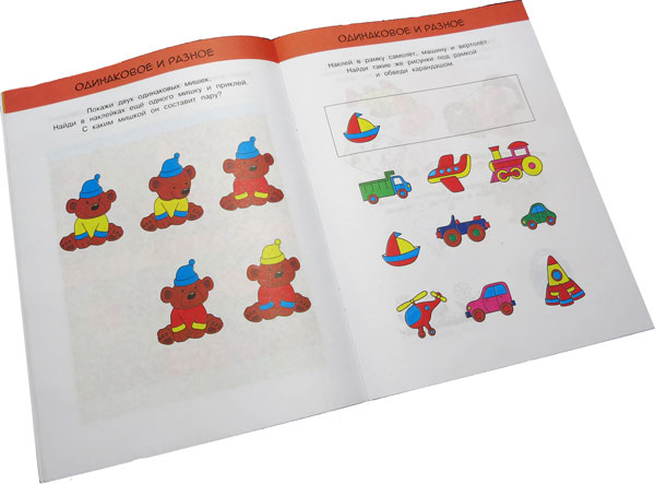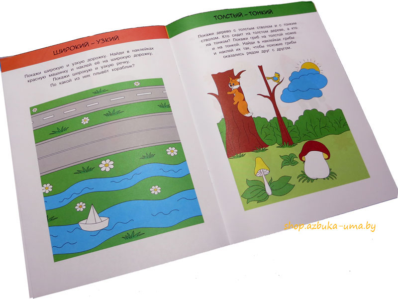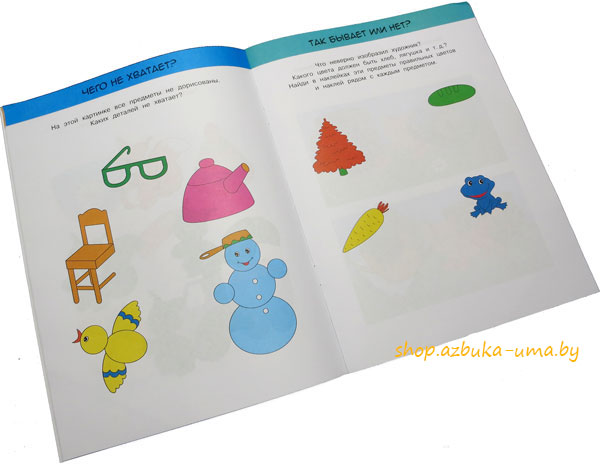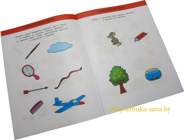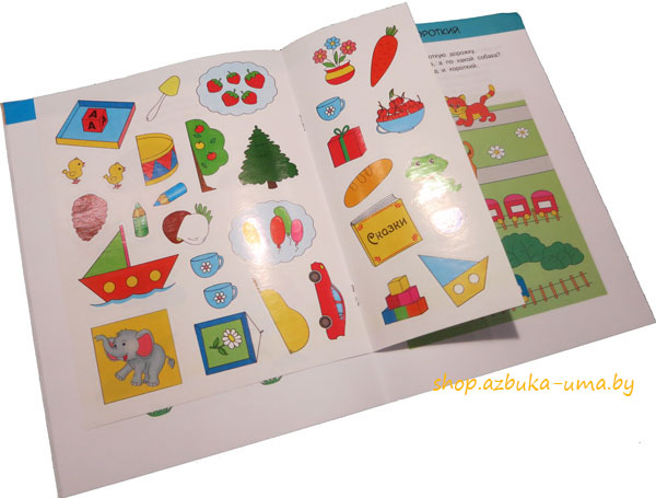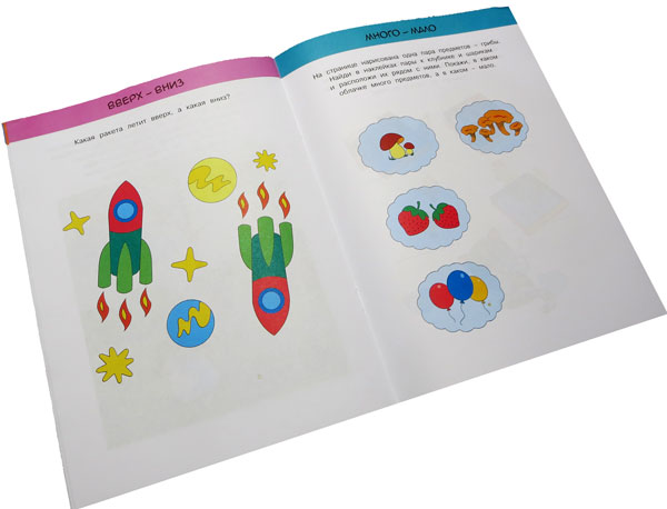 Задания в книгах даны в виде теста. Одно задание на одну страницу. Т.е. ребенка ничего не будет отвлекать от его выполнения. На белой странице - яркие, четкие и понятные рисунки и пустое место, куда следует наклеить правильную наклейку из вкладыша.