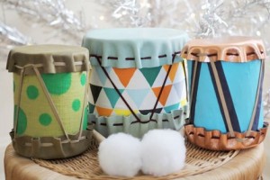 Наклейте на банку бумагу по всей поверхности, кроме крышки. Если банка фигурная, ее можно выкрасить краской или обклеить изолентой. Получился барабан.