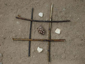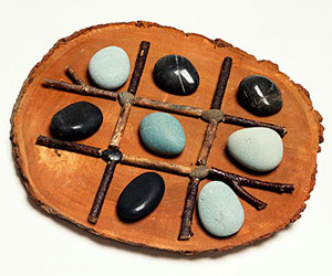 Можно просто рисовать поле на бумаге, а если вы отдыхаете на бегеру реки или озера или решили устроить пикник на поляне, а блокнот с карандашом не взяли? Не беда! Крестики-нолики можно сделать из подручных природных материалов. Идея в том, чтобы найти 5 одинаковых элементов для одного комплекта фишек и 5 для другого.