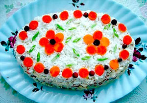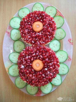 Вот еще идеи для круглых салатов, с круглыми украшениями: