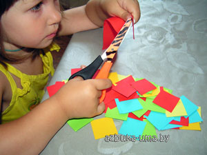 Если Вы доверяете малышу резать бумагу ножницами, то можете предложить ему разрезать бумагу по линиям либо заранее приготовьте материал для аппликации.