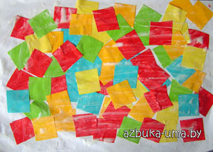 Когда малыш закончит свое творчество, возьмите кисточку и и нанесите сверху слой клея ПВА. Когда он высохнет, то по всей аппликации будет глянцевая пленка, которая очень хорошо приклеит все квадратики к листу, даже если малыш еще плохо умеет обращаться с клей-карандашом.
