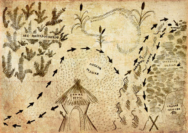 Тигра разложил карту на столе и стал изучать маршрут. Выйдя из дома, он должен пройти мимо Леса Папоротников, переплыть Доисторическое озеро, обойти Лавовый Поток и спуститься по Каменному Ущелью. В конце ущелья его ждет Тайная Пещера. Согласно карте, именно в пещере его ждут спрятанные сокровища.