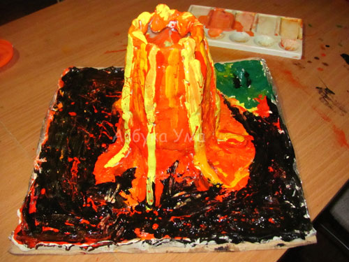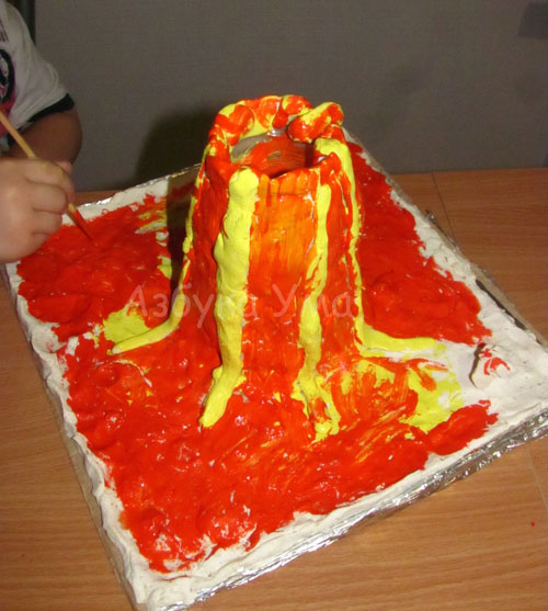 Дальше нужно разукрасить  вулкан. Для  этого нам понадобятся  акриловые  краски оранжевого, красного, желтого,  черного  и зеленого  цветов.  Будем  красить  несколькими слоями.  Первым слоем  у  нас  будет  желтый  цвет,  далее  – красный,  потом  оранжевый  и черный. Закрашиваем небольшой уголок для динозавров зеленым. Поверх черной краски делаем красные брызги при помощи кисточки и пальцев.