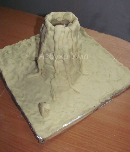 Далее  кончиками  пальцев  сделайте небольшие углубления на вулкане. Далее лепим основу под вулканом. И последний шаг в лепке ­ это делаем подтеки лавы. Для этого скатываем небольшие «Колбаски» и лепим на вулкан.