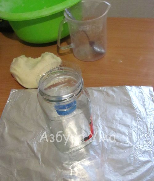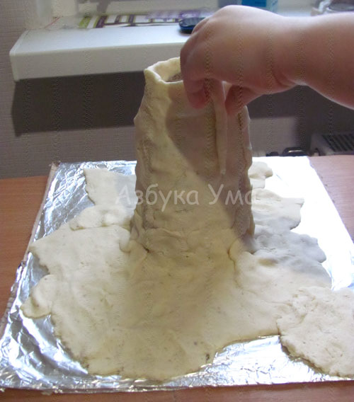 Далее  готовим  соленое  тесто.  Рецепт  мы  брали  тут. Детям  очень  нравится  играть  с  соленым  тестом,  ведь  оно  хорошо  лепится  и развивает мелкую моторику.  Далее начинаем облепливать нашу стеклянную банку.  Для этого,  скатайте  большие  и  толстые  «колбаски»  (ребенку  этот процесс  больше  всего понравился)  и  начинайте  снизу  обклеивать  вулкан.