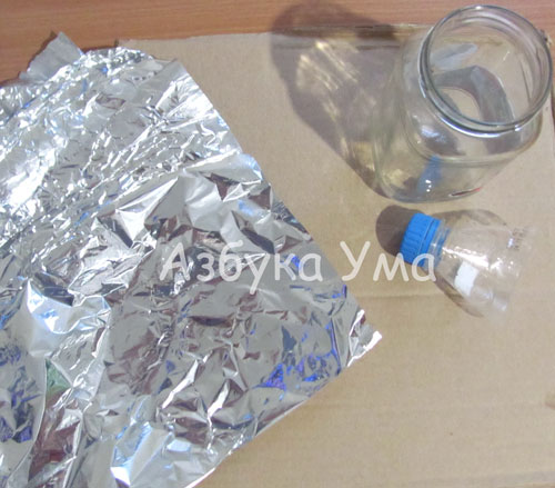 1. Для  основы:  фольга,  плотный  картон, стеклянная  небольшая  банка, пластиковая бутылка 0,5 л.