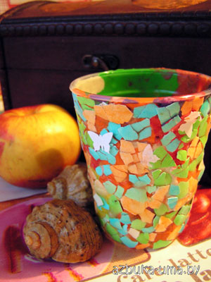 Мы и не выбросили, а решили сделать красивый мозаичный стаканчик с использованием этой самой яичной скорлупы.