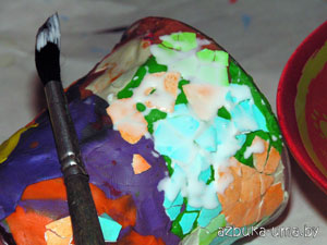 Затем мы прикладывали яичные скорлупки к пластилину и вдавливали их в него, сверху обильно намазывали клеем ПВА. На стаканчик у нас ушло несколько дней. Мы давали клею высохнуть, чтобы не вымазаться в него и случайно не стряхнуть непроклеенные скорлупки.