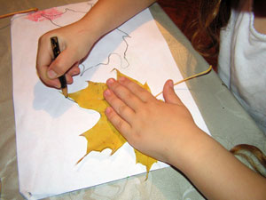 Мы решили сделать аппликацию в виде осенних листьев. Нашли один из них, приложили, обвели...