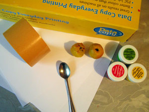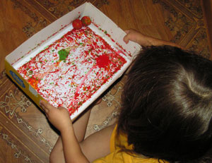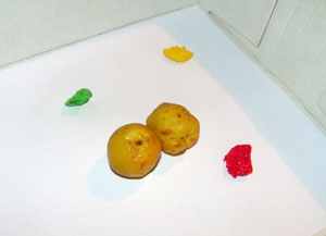 Ложкой выложили краску: желтую, зеленую и красную на лист и положили 2 плода декоративной айвы. Попробуем рисовать фруктами.