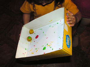 Двигаем крышку и перекатываем фрукты (камешки) по крышке.