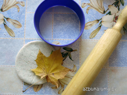 Раскатали пласт толщиной 5-6 мм. Скалкой вкатали кленовый лист в тесто и формочкой вырезали круглый медальон. Если формочки нет, можно воспользоваться блюдцем или чашкой.