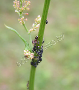 Колония тли черной щавелевой и смотрящий за ними муравей.