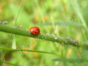 А тут божья коровка охотится за тлей. Как она ее ест мы не видели, но что она этими паразитами питается, дети узнали.