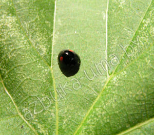А это еще одна удивительная божья коровка: черная в красную точку. Правильно она называется Щитовкоед почковидный. Если чесно, напоминает шлем главного героя из Звездных Войн.