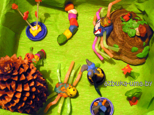 Интересный парк насекомых у вас получился! А мы делали морское дно, т.е разных морских жителей. Они украшали стол старшей дочери довольно долго, но потом младшая решила, что нужно сделать что-нибудь новенькое и "покалечила" некоторых рыбок.