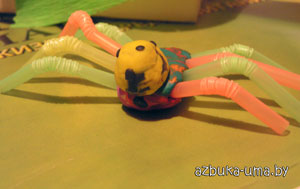 Из пластилина и трубочек София сделала паучка. Черные точки на желтой голове - это 8 глаз :)