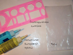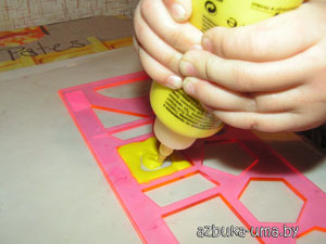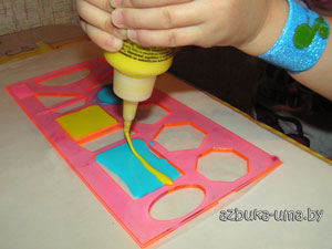 Положите линейку на пластиковую папку или файл и предложите малышу выдавливать витражную краску, заполняя все пространство фигуры. Не волнуйтесь, если лишняя краска затечет под линейку, высохнув форма будет ровной, а лишнее отвалится.