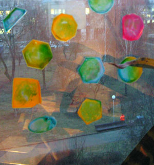 С помощью таких красок можно нарисовать и расположить на окне геометрические фигуры. Несколько КРУГОВ или КВАДРАТОВ, которые можно рассматривать, обводить пальчиком, считать, сравнивать по величине.
