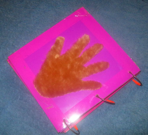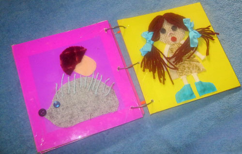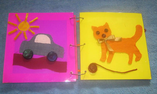 За основу мы взяли упаковочный картон, который обклеили цветным, края покрыли скотчем. На страницах картинки из лоскутков ткани, меха, пуговиц, ниток, шнурочков и ленточек. На обложке лодошки моих деток. Это самые любимые сыном странички.