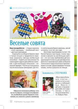Журнал "Супермама" (в России "Счастливая мама") - это журнал советов собирающий опыт и идеи мам, привлекающий консультантов и специалистов для ответов на животрепещущие вопросы. И в "Супермаме" №5 вышел мастер-класс от "Азбуки Ума" про "Милых совят"