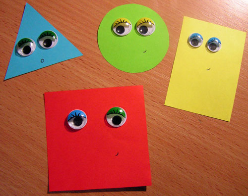 На большом листе бумаги нарисуйте изучаемые фигуры: КВАДРАТ, КРУГ, ТРЕУГОЛЬНИК и ПРЯМОУГОЛЬНИК. Раскрасьте их яркими цветами, развесьте по всей комнате. Когда играете в комнате, можете обращать внимание на рисунки, сравнивать их с предметами в комнате. Нарисуйте фигурам веселые смайлики: улыбки и глазки, сразу станет интереснее и позитивнее.