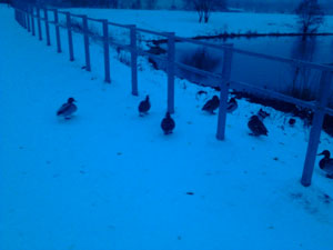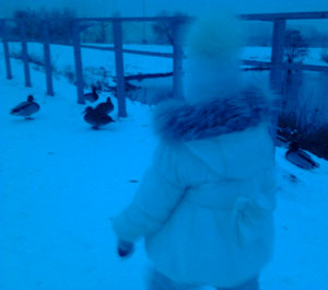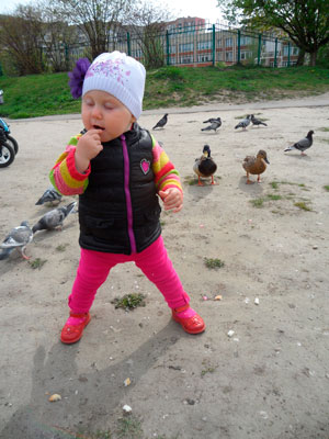 Вера знает, что утки плавают в воде, что говорят они «Кря», что у уточки есть крылья, что носик и ротик – это клюв, что ножки – это лапки, что тело птички покрыто перьями, что летом у уток появляются маленькие утята (наблюдали за ними прошлым летом, в этом году наблюдение будет более осознанное) – всё это мы изучили так сказать опытным путём, глядя на уток вживую на прогулках. Наши утки постоянно выходят к людям и мы постоянно приносим им лакомство в виде батона, правда и сами не прочь перекусить в компании уток. Вот и в этой зимой мы не оставляли наших подопечных и приходили их проведать.