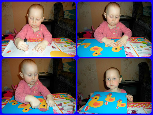 Одним из наиболее любимых видов деятельности у Веры – это аппликация и лепка. На примере аппликации уток мы повторили понятие «большой» - «маленький»: большая утка - маленькая утка, большая шляпа – маленькая шляпка, большой мячик – маленький мячик и т.д. А также опять вспомнили, что у утки есть клюв и крылья.