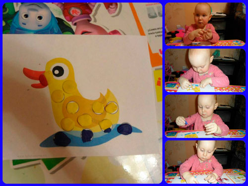 Работа с пластилином отлично развивает мелкую моторику, поэтому картики-заплатки – ещё одно из наших любимых занятий. Вот и уточку мы решили тоже «залатать».