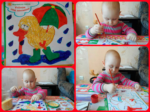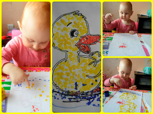 Как и любой ребёнок Вера любит порисовать. С уточкой мы тоже поэкспериментировали. Рисовали не совсем традиционным способом: ватными палочками и пальчиками (без помощи мамы не обошлось).