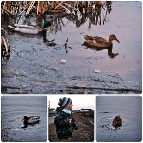 Мы прогулялись на пруд в нашем микрорайоне и нашли там двух замечательных уточек вида Кряква и Серая утка. С сыном мы дали уточкам немного белого хлеба. Съели они все с удовольствием, но практически не подплывали близко к нам. Объяснила сыну,что уточки - это птицы перелетные и как раз весной они мигрировали обратно в Беларусь. Вот теперь будем периодически ходить и высматривать гнездо уточек - Мироша уже хочет увидеть маленьких утят.
