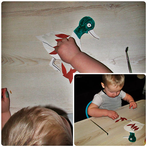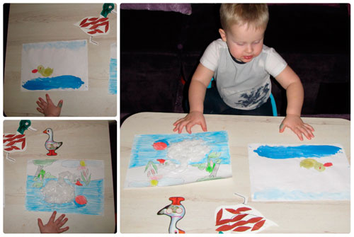 Я спросила о том, холодно ли уточкам. На положительный ответ сына я все же ответила, что перышки уточки смазывают специальным жиром, чтобы не намокнуть и не замерзнуть. Наглядно перышки мы клеили нарисованной уточке уже дома.