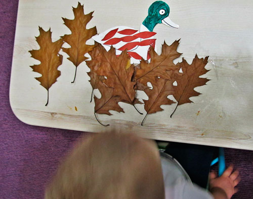 Дома мы нарисованную уточку прятали в листиках, как и уточки на пруду, которые прячутся от врагов в сухой растительности.