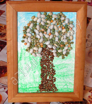 Вариант 1 ‑ аппликация крупой, горохом и фасолью. Очень занимательно и «развивательно». Сделаем картинку для мамы: цветок или дерево. Если потом покрыть лаком, то получится долговечная картинка. У нас осталось немного фасоли? Отлично! С ее помощью мы сделаем замечательный подарок для любимой бабушки (мама, папы, тети…) Это будет необычная картина-аппликация из круп и макарон. Такая аппликация развивает мелкую моторику рук малыша, его усидчивость и внимание, фантазию и воображение.