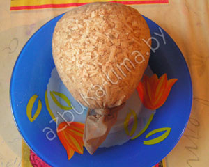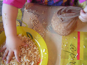 Приступим к творчеству: сначала отрежьте от колгот носок, длиной 20 сантиметров. Попросите малыша сначала засыпать в носок семена травы (около 2 столовых ложек), а потом набить его плотненько опилками, чтобы сформировался шарик. Плотно завязываем основание, чтобы опилки не высыпались.