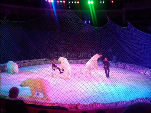 А на десерт – выступление белых мишек. Они такие… такие… такие! Не передать словами. Они белые, огромные, смешные… Один из них развалился на льду и превратился в коврик, второй флегматично слизывал лед и ковырял его лапой, третий замер как статуя, а четвёртый выдедывал с дрессировщицей такое! Это надо увидеть…