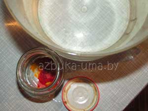 В баночку насыпьте краситель, или разведите гуашь, закройте крышкой и опустите в емкость с холодной водой.