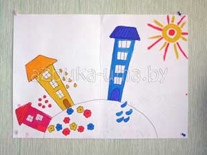 На полянке между красным и синим домоком появился ЖЕЛТЫЙ. Она заметила его издалека, потому что цвет очень яркий и сразу приковывает к себе внимание. Напомню, что я постепенно рисую картину, добавляя в нее изучаемый цвет. К концу месяца, картина будет полностью нарисована, и я надеюсь, что моя маленькая дочка с ее помощью выучит все основные цвета.