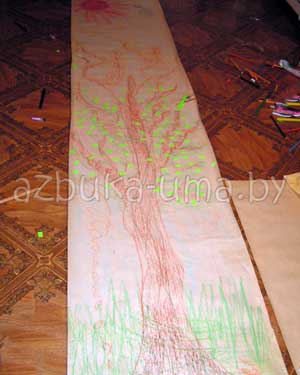 Т.к. действие спектакля происходит в волшебном лесу, Катюша задумала нарисовать волшебное дерево. У него на ветках живут сразу все поры года: зеленые летние листья, желтые осенние, и только появляющиеся из почек весенние, а сверху - голые зимние ветки.