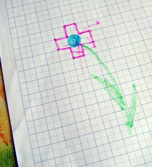 Теперь цветку можно нарисовать серединку цветными карандашами. и пририсовать стебелек с листиками. Может Вашему ребенку понравилось рисовать по клеточкам? Тогда он может нарисовать целую поляну цветов!