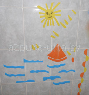 Пошли клеить... Фурор! Просто намочил, приложил к плитке и готово, ребенок очень был рад и легко снимать потом. Правда, у Янушки было свое видение как это должно клеиться и в какой последовательности, и грибы это или нет, ну этого мне только и надо было, так что план удался.