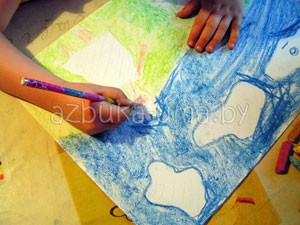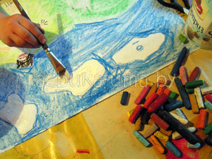 Затем намазали клеем белые части рисунка и присыпали их опилками.