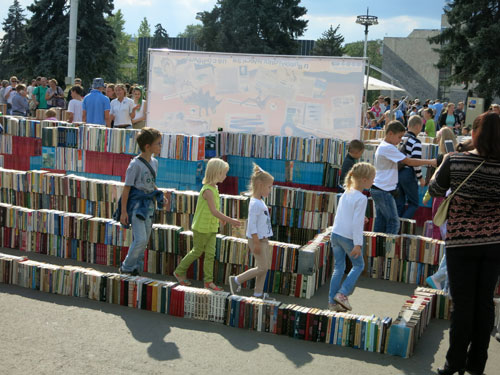 Пробыв на выставке около 4 часов, я вышла на свежий воздух. Ярмарка проходила на территории ВДНХ, и в этот день Москва праздновала свой День рождения. На ВДНХ организовали "Город детей" - мероприятия для детского отдыха в честь праздника. Меня очень порадовал книжный лабиринт для детей, а рядом была "библиотека" в которой можно было порыться, найти и забрать книгу с собой. На момент моего посещения "библиотеки" там оставлись только списки-справочники технического института. Хотя из очереди выныривали счастливые и довольние человечки, в обнимку с доставшейся книгой.