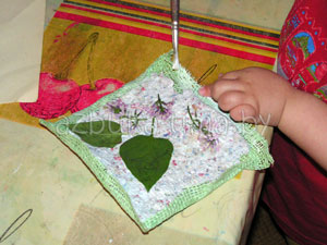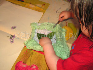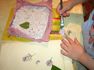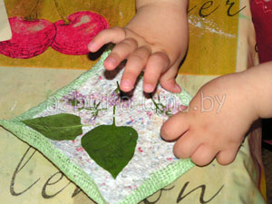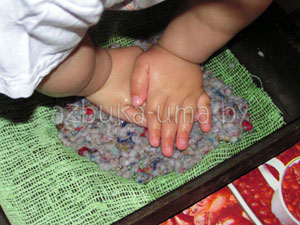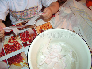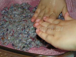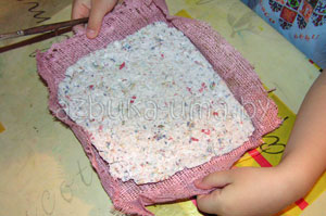 Выкладываем массу на кусок ткани. Попросите малыша распределить папье-маше тонким слоем и сформировать прямоугольник.